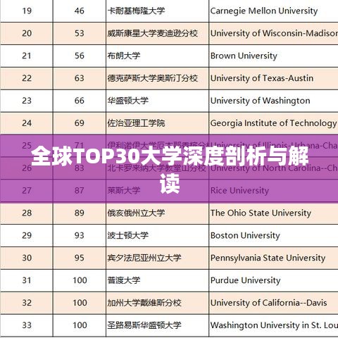 在全球大学排名中,位列前30名的大学无一不是拥有悠久历史、卓越学术成就和丰富教学资源的顶尖学府,这些大学分布在世界各地,从美洲到亚洲,从欧洲到澳洲,它们以各自独特的办学特色和学术优势吸引着全球最优秀的学子。